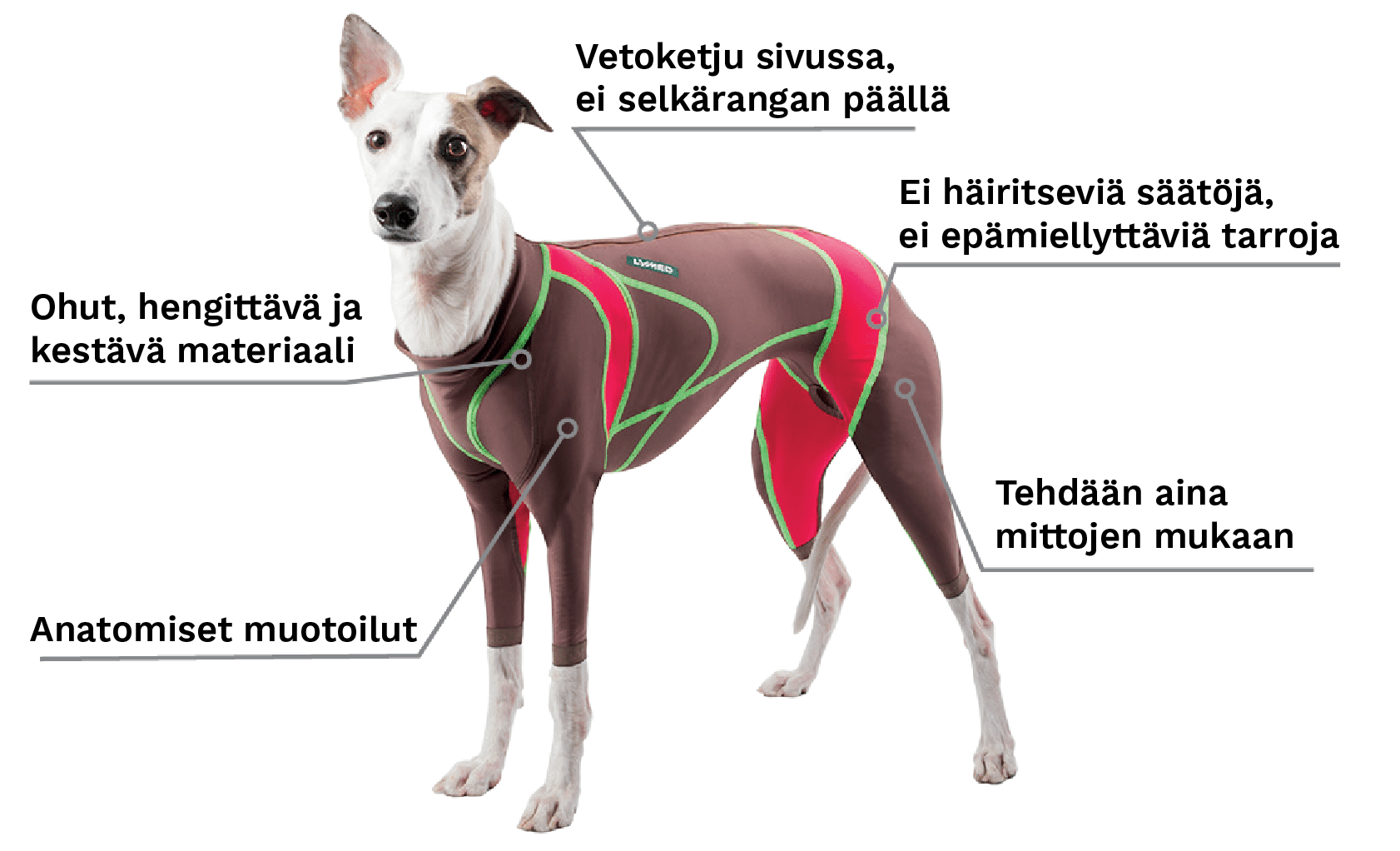 Kaikki Lymed Dog-tuotteet valmistetaan yksilöllisesti koiran mittojen perusteella, taaten istuvuuden jokaiselle, karvoihin katsomatta. Painevaate on suunniteltu koiran mukavuus huomioiden.